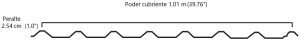 La lámina R-101 tiene un poder cubriente de 1.01m y un peralte de 2.54 cm. Se fabrica en nuestras plantas productivas mediante roladoras estacionarias a partir de rollos de acero con un desarrollo de 1.22m de ancho, para ser utilizado como cubierta de fijación expuesta. Puede utilizarse en naves industriales, bodegas y construcciones en general, donde se requiera mediana capacidad estructural y de desagüe. El perfil es 100% compatible con los R-101, R-72, T-18, T-81, T-8 y T-80.Geometría